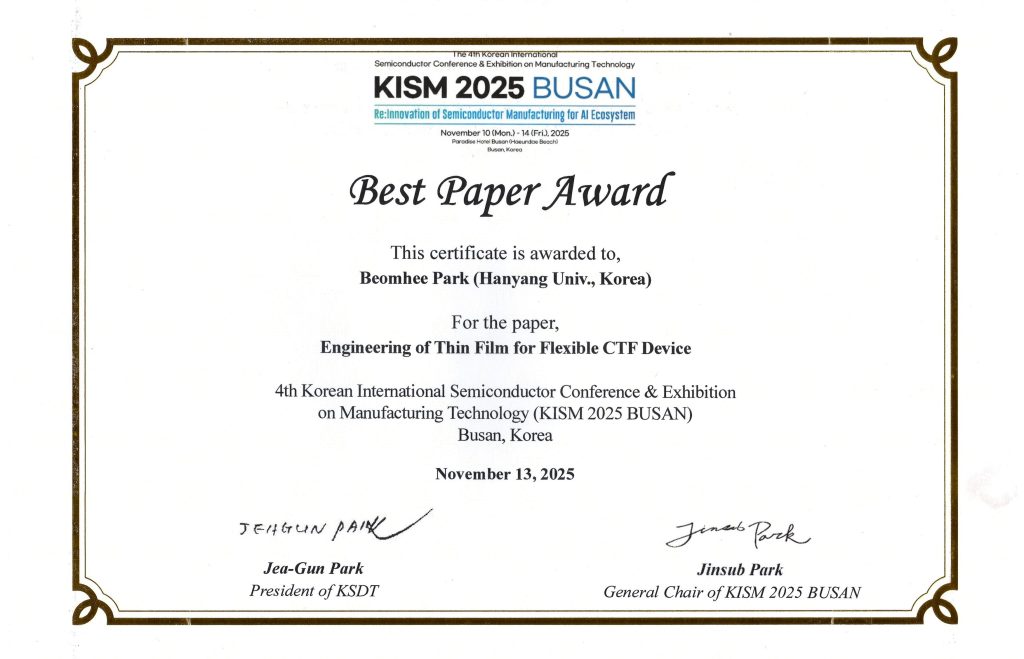 [수상] 박범희 박사과정생, 2025 Korean International Semiconductor Conference & Exhibition on Manufacturing Technology (KISM) Best Paper Award 수상