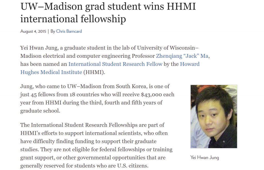 Prof. Jung is selected as the Howard Hughes Medical Institute (HHMI) International Student Research Fellow.